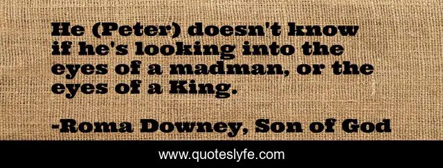 This page presents the quote "He (Peter) doesn't know if he's looking into the eyes of a madman, or the eyes of a King.". Author of this quote is Roma Downey, Son of God. This quote is about christianity, leadership, discipleship, vision, jesus,.