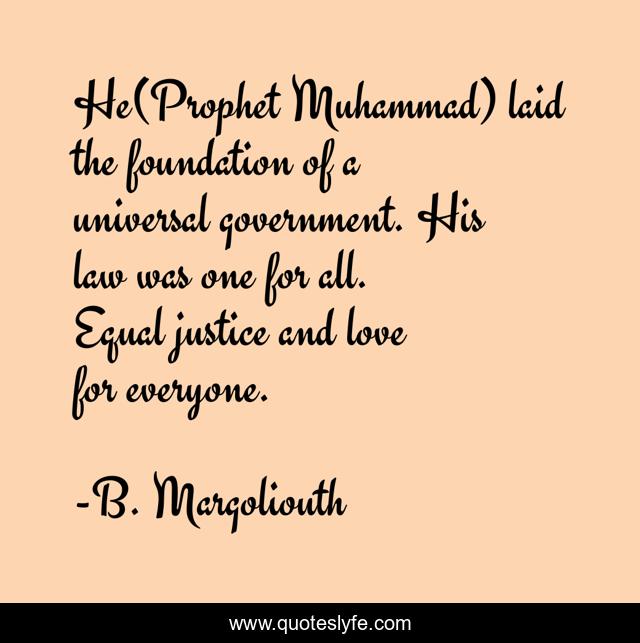 This page presents the quote "He(Prophet Muhammad) laid the foundation of a universal government. His law was one for all. Equal justice and love for everyone.". Author of this quote is B. Margoliouth. This quote is about lessons, life, everyone, equality, love, justice, freedom, guidance, peace,.