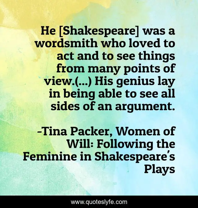 This page presents the quote "He [Shakespeare] was a wordsmith who loved to act and to see things from many points of view.(...) His genius lay in being able to see all sides of an argument.". Author of this quote is Tina Packer, Women of Will: Following the Feminine in Shakespeare's Plays. This quote is about plays, shakespeare, feminism, women,.