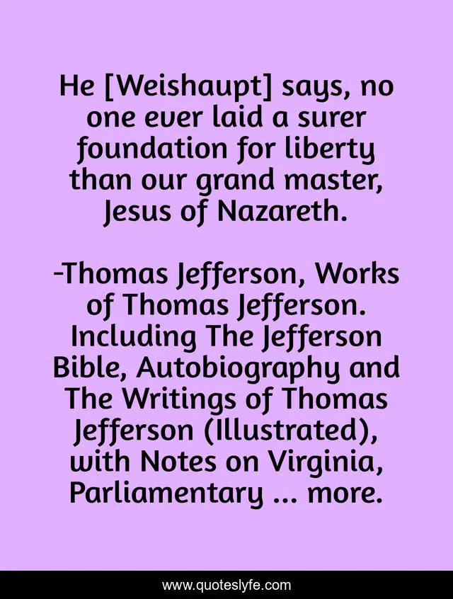 This page presents the quote "He [Weishaupt] says, no one ever laid a surer foundation for liberty than our grand master, Jesus of Nazareth.". Author of this quote is Thomas Jefferson, Works of Thomas Jefferson. Including The Jefferson Bible, Autobiography and The Writings of Thomas Jefferson (Illustrated), with Notes on Virginia, Parliamentary ... more.. This quote is about illuminati, freedom, liberty, jesus,.