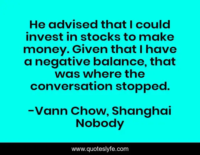 This page presents the quote "He advised that I could invest in stocks to make money. Given that I have a negative balance, that was where the conversation stopped.". Author of this quote is Vann Chow, Shanghai Nobody. This quote is about poor, chinese, money, shanghai-nobody, poverty, china, investment, bank,.