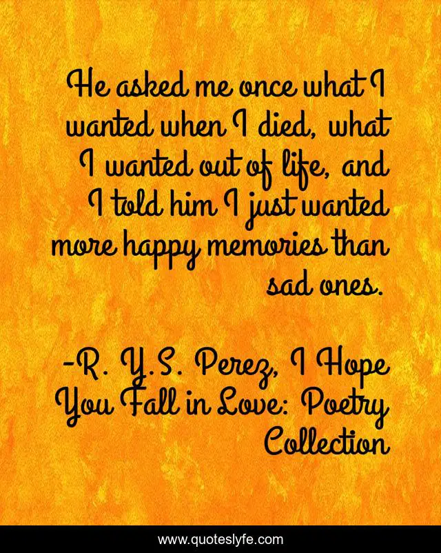 This page presents the quote "He asked me once what I wanted when I died, what I wanted out of life, and I told him I just wanted more happy memories than sad ones.". Author of this quote is R. Y.S. Perez, I Hope You Fall in Love: Poetry Collection. This quote is about death, happy-memories, memories, happy-life, full-life, happiness,.