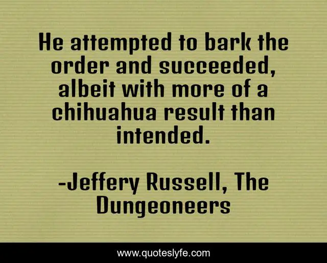 This page presents the quote "He attempted to bark the order and succeeded, albeit with more of a chihuahua result than intended.". Author of this quote is Jeffery Russell, The Dungeoneers. This quote is about chihuahua, swooning-over-sentences, dogs, pretty-prose,.