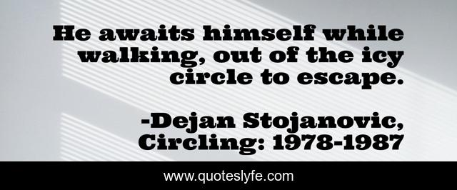This page presents the quote "He awaits himself while walking, out of the icy circle to escape.". Author of this quote is Dejan Stojanovic, Circling: 1978-1987. This quote is about walking, literature, dejan-stojanovic, poetry, wisdom, quotes, icy, circling, escape,.