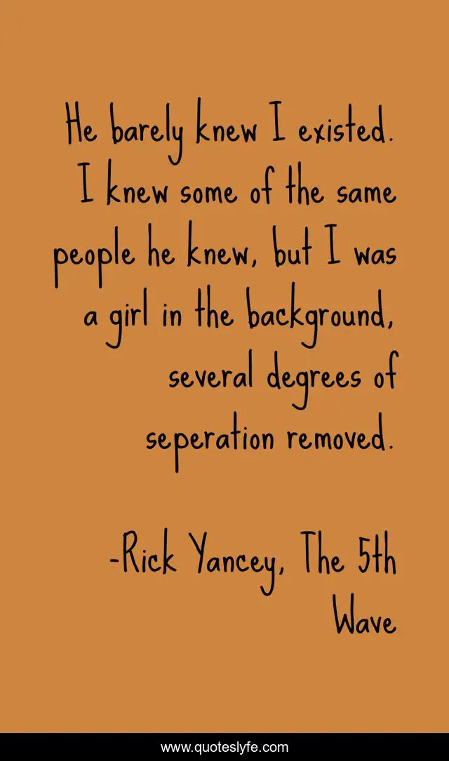 This page presents the quote "He barely knew I existed. I knew some of the same people he knew, but I was a girl in the background, several degrees of seperation removed.". Author of this quote is Rick Yancey, The 5th Wave. This quote is about crush, boy, girl, background,.
