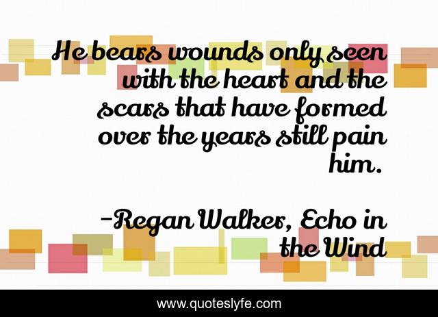 This page presents the quote "He bears wounds only seen with the heart and the scars that have formed over the years still pain him.". Author of this quote is Regan Walker, Echo in the Wind. This quote is about heartache, wounds-of-the-heart, pain-from-old-wounds,.