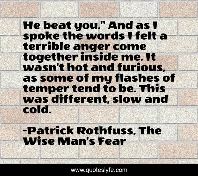 This page presents the quote "He beat you." And as I spoke the words I felt a terrible anger come together inside me. It wasn't hot and furious, as some of my flashes of temper tend to be. This was different, slow and cold.". Author of this quote is Patrick Rothfuss, The Wise Man's Fear. .