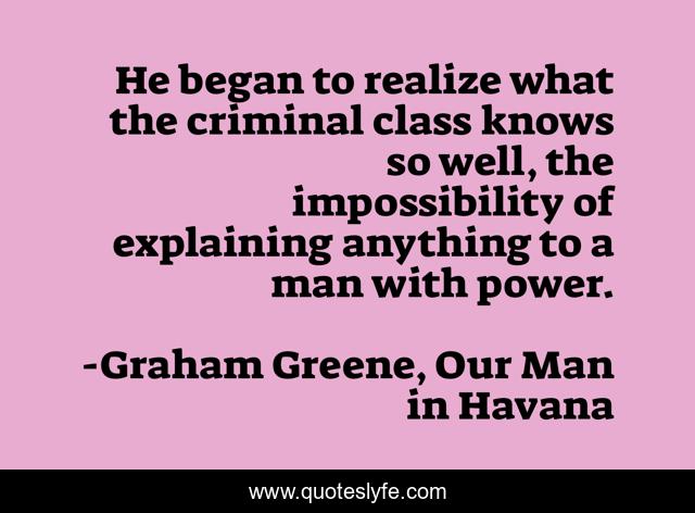 This page presents the quote "He began to realize what the criminal class knows so well, the impossibility of explaining anything to a man with power.". Author of this quote is Graham Greene, Our Man in Havana. .