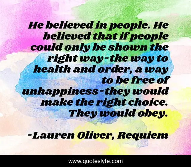 This page presents the quote "He believed in people. He believed that if people could only be shown the right way-the way to health and order, a way to be free of unhappiness-they would make the right choice. They would obey.". Author of this quote is Lauren Oliver, Requiem. .