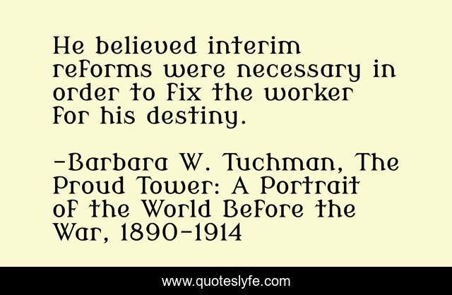 This page presents the quote "He believed interim reforms were necessary in order to fix the worker for his destiny.". Author of this quote is Barbara W. Tuchman, The Proud Tower: A Portrait of the World Before the War, 1890-1914. .