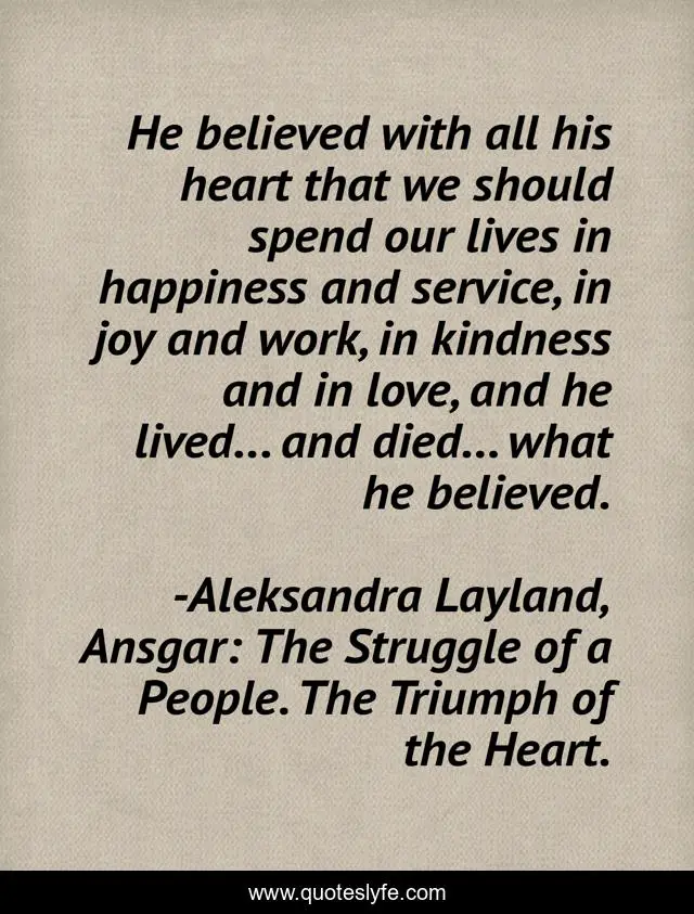 This page presents the quote "He believed with all his heart that we should spend our lives in happiness and service, in joy and work, in kindness and in love, and he lived... and died... what he believed.". Author of this quote is Aleksandra Layland, Ansgar: The Struggle of a People. The Triumph of the Heart.. This quote is about love, belief, joy, work-ethic, happiness, service-to-mankind, kindness, affection,.