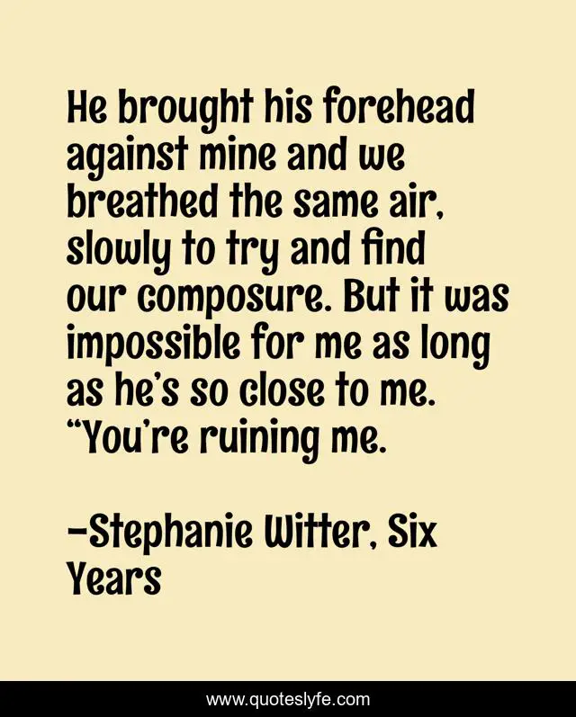 This page presents the quote "He brought his forehead against mine and we breathed the same air, slowly to try and find our composure. But it was impossible for me as long as he’s so close to me. “You’re ruining me.�". Author of this quote is Stephanie Witter, Six Years. This quote is about six-years, new-adult, romance-book, contemporary-romance, new-adult-contemporary-romance, contemporary, romance, romance-novel, friends-to-lovers,.