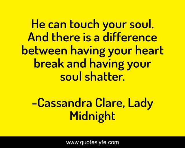 This page presents the quote "He can touch your soul. And there is a difference between having your heart break and having your soul shatter.". Author of this quote is Cassandra Clare, Lady Midnight. This quote is about love, emma-carstairs, lady-midnight, cristina-rosales, heartbreak, forbidden-love, affection,.
