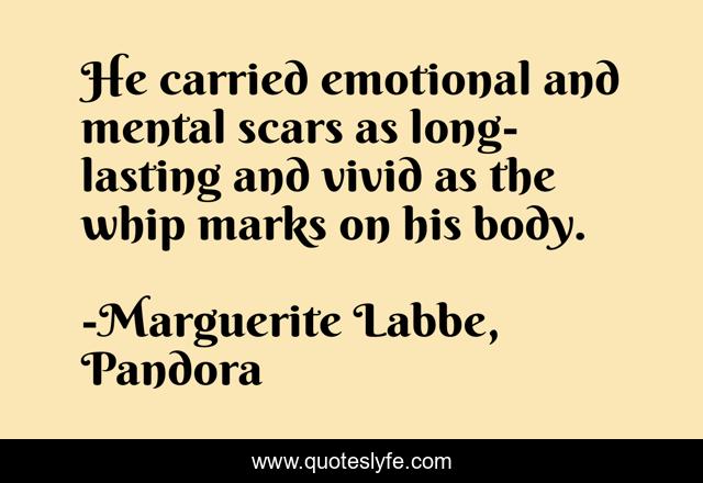 This page presents the quote "He carried emotional and mental scars as long-lasting and vivid as the whip marks on his body.". Author of this quote is Marguerite Labbe, Pandora. .