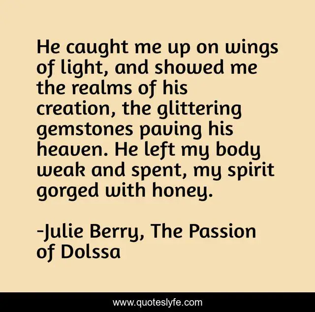 This page presents the quote "He caught me up on wings of light, and showed me the realms of his creation, the glittering gemstones paving his heaven. He left my body weak and spent, my spirit gorged with honey.". Author of this quote is Julie Berry, The Passion of Dolssa. This quote is about enthusiasm, religious, inspirational,.