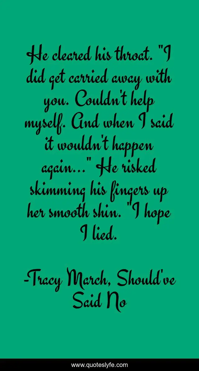 This page presents the quote "He cleared his throat. "I did get carried away with you. Couldn't help myself. And when I said it wouldn't happen again..." He risked skimming his fingers up her smooth shin. "I hope I lied.". Author of this quote is Tracy March, Should've Said No. This quote is about small-town-romance, contemporary-romance, cowboy-romance,.