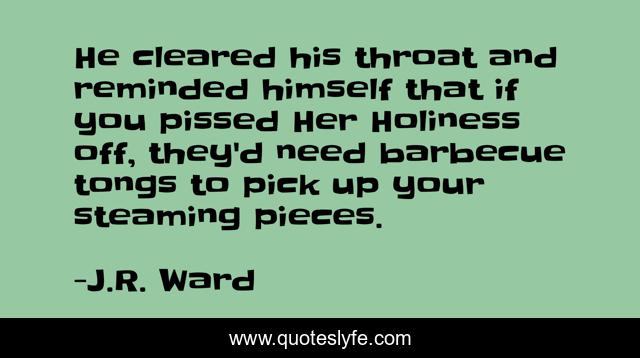 This page presents the quote "He cleared his throat and reminded himself that if you pissed Her Holiness off, they'd need barbecue tongs to pick up your steaming pieces.". Author of this quote is J.R. Ward. This quote is about vishous, black-dagger-brotherhood, vampire, v,.