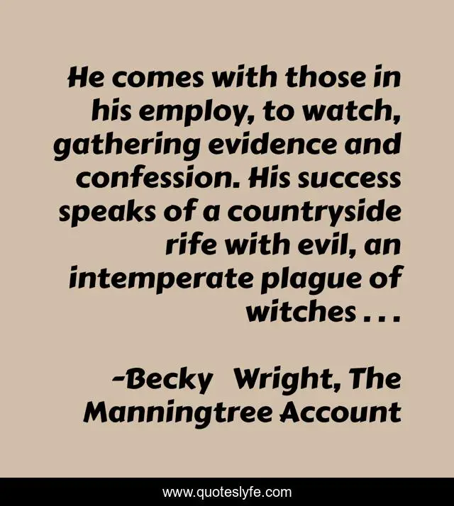 This page presents the quote "He comes with those in his employ, to watch, gathering evidence and confession. His success speaks of a countryside rife with evil, an intemperate plague of witches . . .". Author of this quote is Becky Wright, The Manningtree Account. This quote is about supernatural-thriller, witches,.