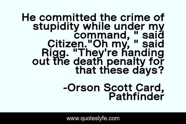 This page presents the quote "He committed the crime of stupidity while under my command, " said Citizen."Oh my, " said Rigg. "They're handing out the death penalty for that these days?". Author of this quote is Orson Scott Card, Pathfinder. This quote is about military, humor,.