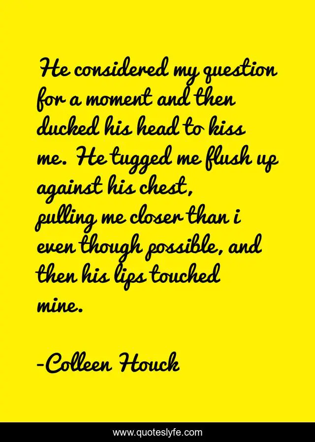 This page presents the quote "He considered my question for a moment and then ducked his head to kiss me. He tugged me flush up against his chest, pulling me closer than i even though possible, and then his lips touched mine.". Author of this quote is Colleen Houck. .