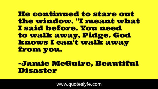 This page presents the quote "He continued to stare out the window. "I meant what I said before. You need to walk away, Pidge. God knows I can't walk away from you.". Author of this quote is Jamie McGuire, Beautiful Disaster. This quote is about beautiful, emotional, sweet,.