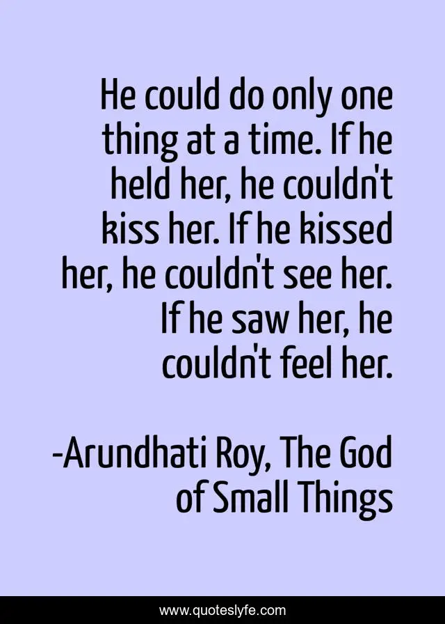 This page presents the quote "He could do only one thing at a time. If he held her, he couldn't kiss her. If he kissed her, he couldn't see her. If he saw her, he couldn't feel her.". Author of this quote is Arundhati Roy, The God of Small Things. .