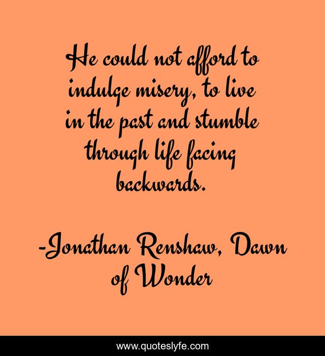 This page presents the quote "He could not afford to indulge misery, to live in the past and stumble through life facing backwards.". Author of this quote is Jonathan Renshaw, Dawn of Wonder. This quote is about on, life, backwards, look, move, walk, past, future, misery,.