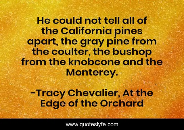 This page presents the quote "He could not tell all of the California pines apart, the gray pine from the coulter, the bushop from the knobcone and the Monterey.". Author of this quote is Tracy Chevalier, At the Edge of the Orchard. This quote is about californiana, trees,.