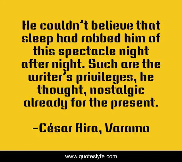 This page presents the quote "He couldn’t believe that sleep had robbed him of this spectacle night after night. Such are the writer’s privileges, he thought, nostalgic already for the present.". Author of this quote is César Aira, Varamo. This quote is about writers, nostalgia,.