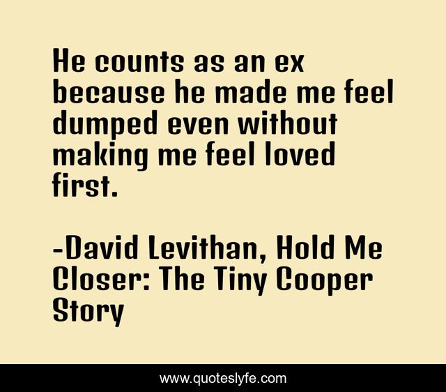 This page presents the quote "He counts as an ex because he made me feel dumped even without making me feel loved first.". Author of this quote is David Levithan, Hold Me Closer: The Tiny Cooper Story. This quote is about relationship, heartbreak, love, ex, affection,.