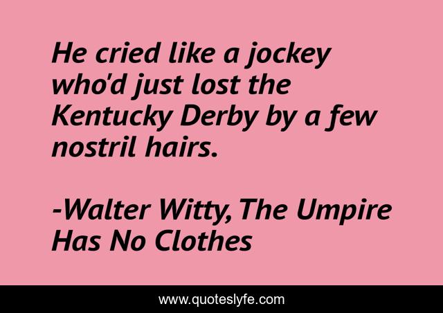 This page presents the quote "He cried like a jockey who'd just lost the Kentucky Derby by a few nostril hairs.". Author of this quote is Walter Witty, The Umpire Has No Clothes. This quote is about humor, sports,.