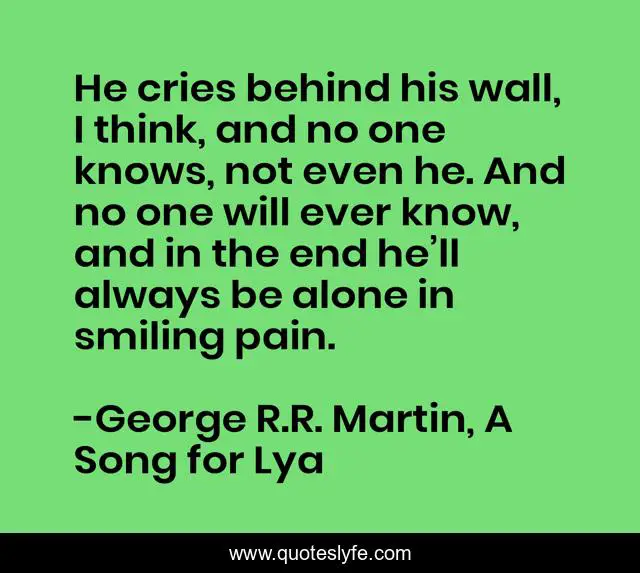 This page presents the quote "He cries behind his wall, I think, and no one knows, not even he. And no one will ever know, and in the end he’ll always be alone in smiling pain.". Author of this quote is George R.R. Martin, A Song for Lya. This quote is about melancholy, sadness, depression,.