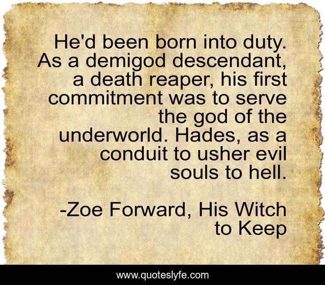 This page presents the quote "He'd been born into duty. As a demigod descendant, a death reaper, his first commitment was to serve the god of the underworld. Hades, as a conduit to usher evil souls to hell.". Author of this quote is Zoe Forward, His Witch to Keep. This quote is about death-reaper, witch, paranormal-romance,.