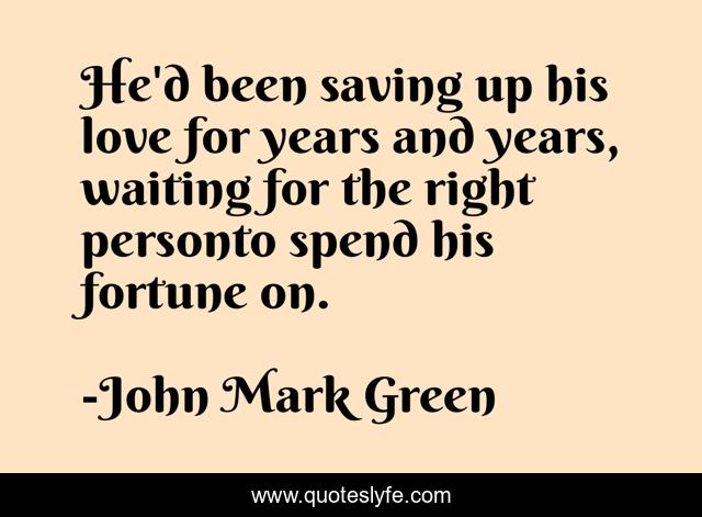This page presents the quote "He'd been saving up his love for years and years, waiting for the right personto spend his fortune on.". Author of this quote is John Mark Green. This quote is about relationships, looking-for-love, falling-in-love, love, romantic, searching-for-love, single, affection,.