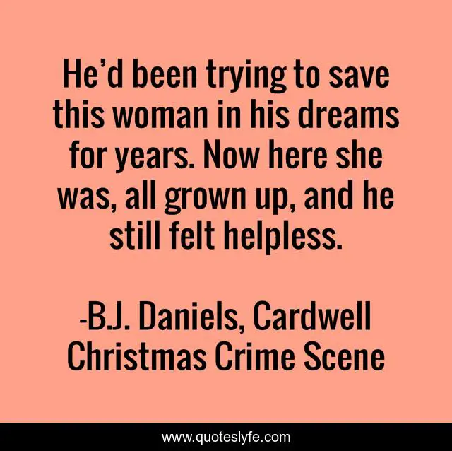 This page presents the quote "He’d been trying to save this woman in his dreams for years. Now here she was, all grown up, and he still felt helpless.". Author of this quote is B.J. Daniels, Cardwell Christmas Crime Scene. This quote is about mystery, holiday, romantic-suspense, christmas, western,.