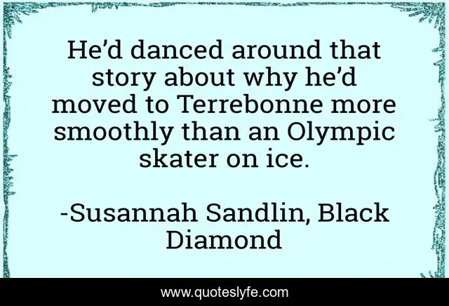 This page presents the quote "He’d danced around that story about why he’d moved to Terrebonne more smoothly than an Olympic skater on ice.". Author of this quote is Susannah Sandlin, Black Diamond. This quote is about drug-runners, romantic-thriller, alligators, wildlife-agents, romantic-suspense,.