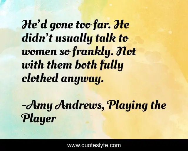 This page presents the quote "He’d gone too far. He didn’t usually talk to women so frankly. Not with them both fully clothed anyway.". Author of this quote is Amy Andrews, Playing the Player. This quote is about humor, amy-andrews, brazen, romance, quotes, hot-rugby-dudes, playing-the-player, rugby, sydney-smoke-rugby-series,.