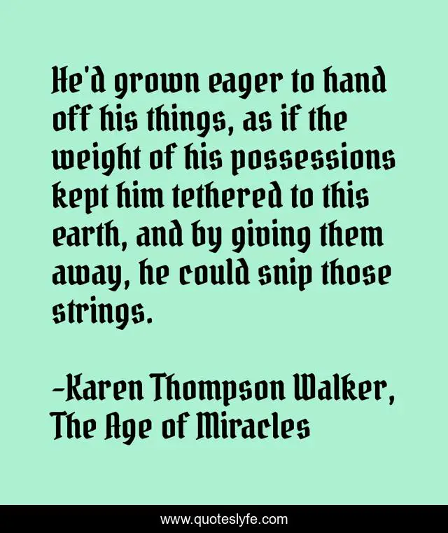 This page presents the quote "He'd grown eager to hand off his things, as if the weight of his possessions kept him tethered to this earth, and by giving them away, he could snip those strings.". Author of this quote is Karen Thompson Walker, The Age of Miracles. This quote is about aging, death,.