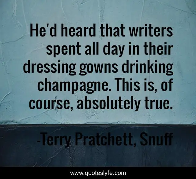 This page presents the quote "He'd heard that writers spent all day in their dressing gowns drinking champagne. This is, of course, absolutely true.". Author of this quote is Terry Pratchett, Snuff. .
