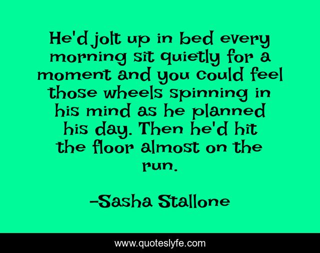 This page presents the quote "He'd jolt up in bed every morning sit quietly for a moment and you could feel those wheels spinning in his mind as he planned his day. Then he'd hit the floor almost on the run.". Author of this quote is Sasha Stallone. .