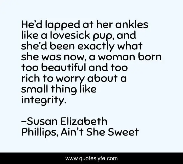 This page presents the quote "He’d lapped at her ankles like a lovesick pup, and she’d been exactly what she was now, a woman born too beautiful and too rich to worry about a small thing like integrity.". Author of this quote is Susan Elizabeth Phillips, Ain't She Sweet. This quote is about beautiful, puppy-love, lovesick, integrity, rich,.