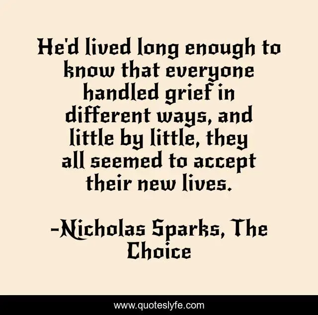 This page presents the quote "He'd lived long enough to know that everyone handled grief in different ways, and little by little, they all seemed to accept their new lives.". Author of this quote is Nicholas Sparks, The Choice. This quote is about grief, life, accept,.