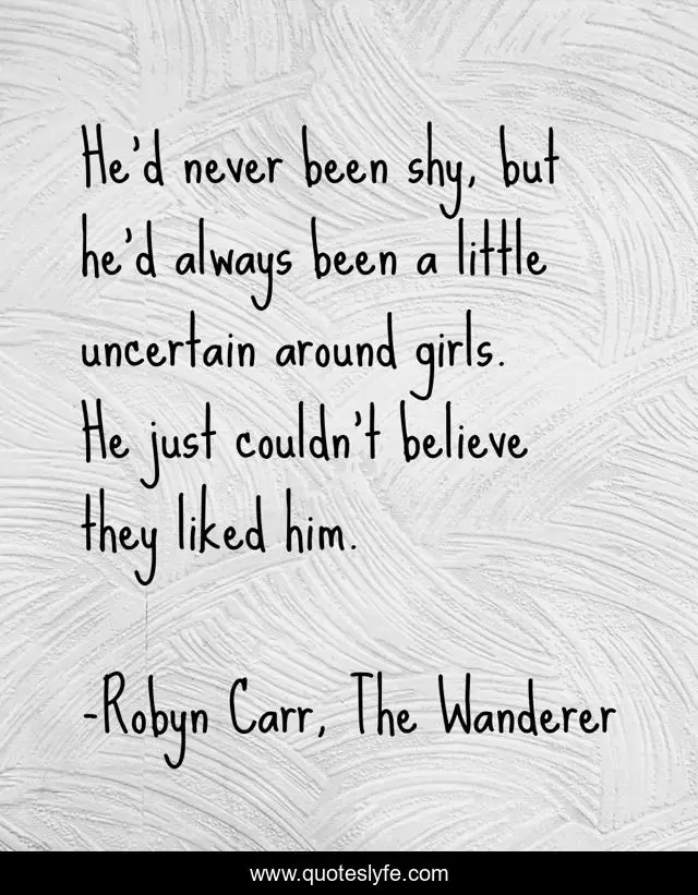 This page presents the quote "He’d never been shy, but he’d always been a little uncertain around girls. He just couldn’t believe they liked him.". Author of this quote is Robyn Carr, The Wanderer. This quote is about romance, funny, comedy, contemporary-romance, humour,.