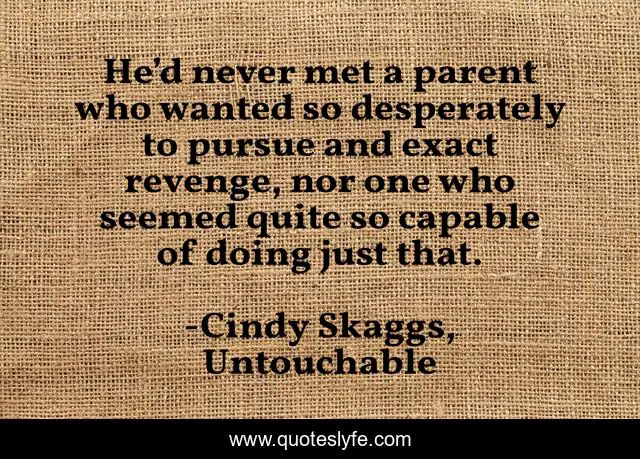 This page presents the quote "He’d never met a parent who wanted so desperately to pursue and exact revenge, nor one who seemed quite so capable of doing just that.". Author of this quote is Cindy Skaggs, Untouchable. This quote is about cindy-skaggs, quote, untouchable,.