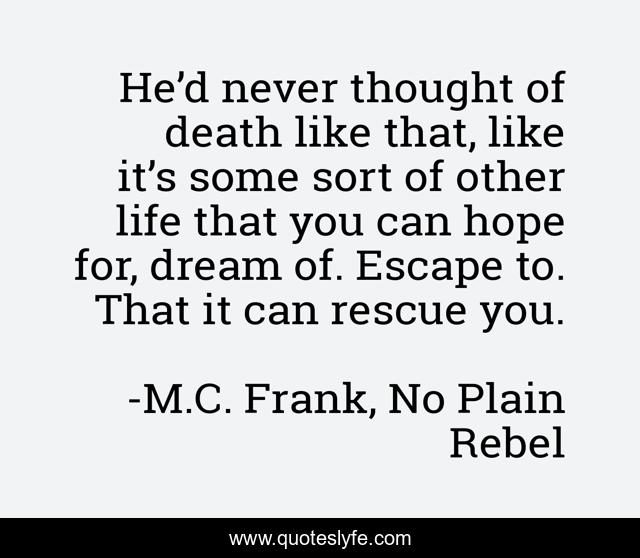 This page presents the quote "He’d never thought of death like that, like it’s some sort of other life that you can hope for, dream of. Escape to. That it can rescue you.". Author of this quote is M.C. Frank, No Plain Rebel. This quote is about boy, life, magic, clockwork-princess, scifi, stars, tin-soldier, love, girl,.