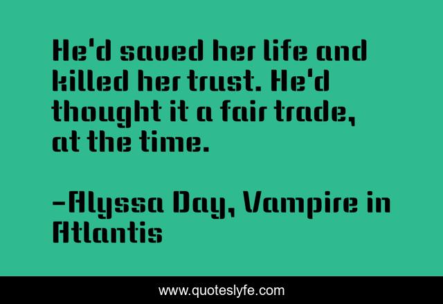 This page presents the quote "He'd saved her life and killed her trust. He'd thought it a fair trade, at the time.". Author of this quote is Alyssa Day, Vampire in Atlantis. This quote is about alyssa, atlantis, vampire, day, in,.