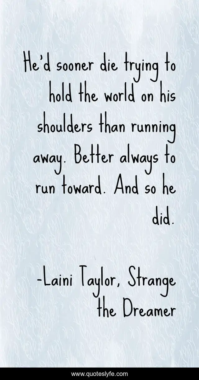 This page presents the quote "He'd sooner die trying to hold the world on his shoulders than running away. Better always to run toward. And so he did.". Author of this quote is Laini Taylor, Strange the Dreamer. This quote is about survive, responsibility, hope, fight,.