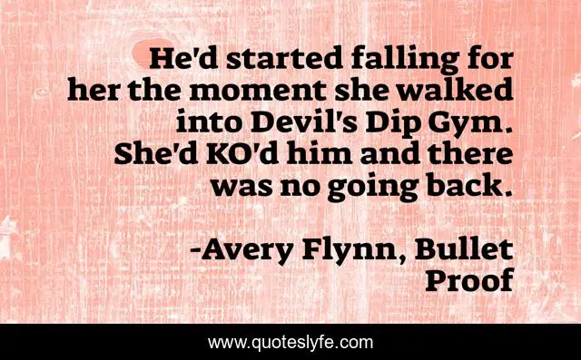 This page presents the quote "He'd started falling for her the moment she walked into Devil's Dip Gym. She'd KO'd him and there was no going back.". Author of this quote is Avery Flynn, Bullet Proof. .
