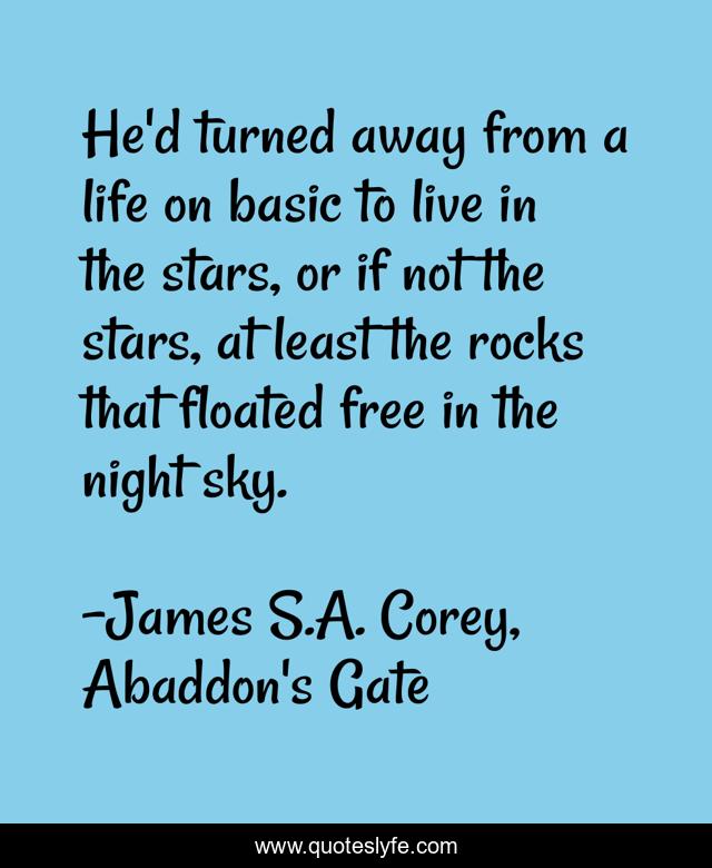 This page presents the quote "He'd turned away from a life on basic to live in the stars, or if not the stars, at least the rocks that floated free in the night sky.". Author of this quote is James S.A. Corey, Abaddon's Gate. .
