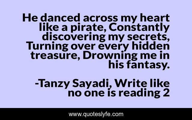 This page presents the quote "He danced across my heart like a pirate, Constantly discovering my secrets, Turning over every hidden treasure, Drowning me in his fantasy.". Author of this quote is Tanzy Sayadi, Write like no one is reading 2. This quote is about drowning, secrets, treasure, fantasy, hidden, pirate,.